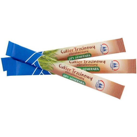 * DIAMANT Cukier trzcinowy w saszetkach to nierafinowany cukier trzcinowy Dry Demerara, pakowany prostokątne, estetyczne saszetki, przeznaczony do słodzenia gorących napojów