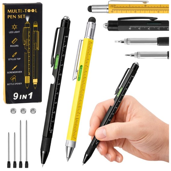 • Długopisy Wielofunkcyjne 9w1 Poziomica Latarka Śrubokręt Żółty Czarny 2szt