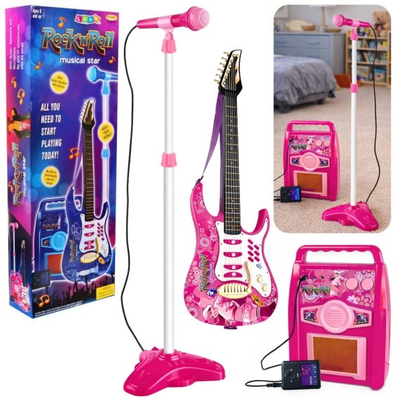 Dołączony do kompletu statyw ułatwia zamontowanie mikrofonu przed dzieciakiem. W prosty sposób można regulować jego wysokość, która może osiągnąć od 65 cm do 109 cm. Zabawkowy mikrofon po podłączeniu do gitary przesyła wokal dziecka do wbudowanego głośnika, z którego następnie wybrzmiewa. Wzmacniacz, tak samo, jak gitara, ma wbudowaną regulację głośności, a także trzy różne porty: na mikrofon, gitarę i odtwarzacz MP3.