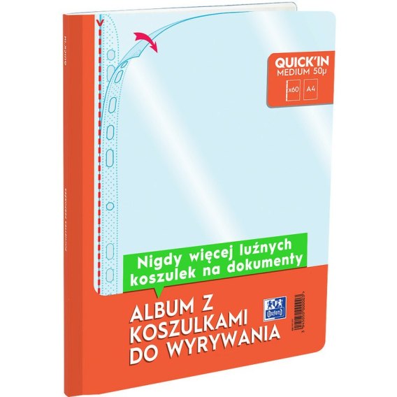 * Niezwykle praktyczny album z koszulkami do wyrywania - zajmuje tyle miejsca, co zeszyt A4. Mikroperforacja umożliwia łatwe odrywanie koszulek. Krystaliczne koszulki Quick'in to nie tylko doskonała ochrona dla dokumentów, idealnie przejrzysta widoczność zawartości, ale również wygoda użytkowania dzięki specjalnie wyprofilowanemu górnemu rogowi, co znacznie ułatwia wkładanie dokumentów.. To innowacyjny, opatentowany system wyrywania koszulek, który pomaga zachować porządek i daje nowe możliwości użytkowania. Można go włożyć do pojemnika na czasopisma, schować w szufladzie, ustawić na półce oraz przenosić w plecaku lub torbie