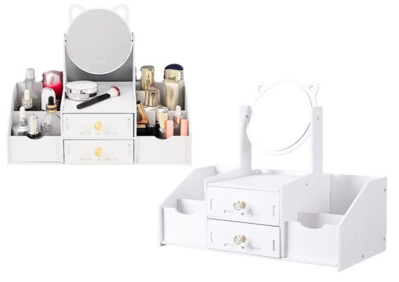 Biała toaletka z lusterkiem z uszkami, idealna do zabawy w makijaż i stylizację. Posiada szufladki i przegródki na kosmetyki i biżuterię. Wykonana z trwałych, bezpiecznych materiałów. Prosta w montażu dzięki dołączonej instrukcji.