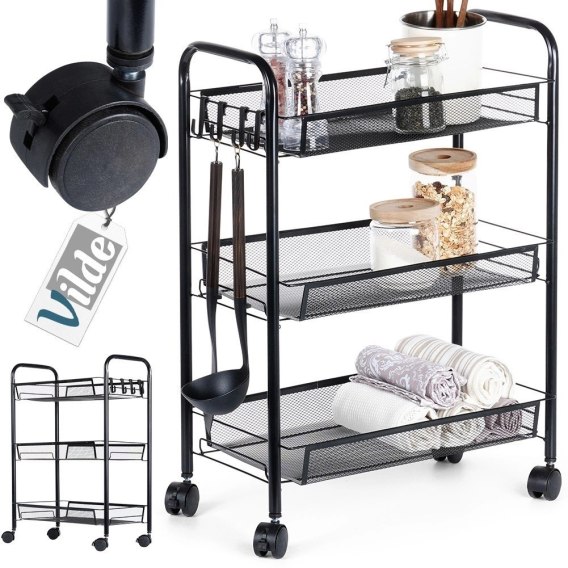 ⭐ Pojemny, z trzema koszykami i haczykami - Wózek posiada trzy koszyki do przechowywania. Zajmuje niewielką powierzchnię, a jednocześnie jest bardzo pojemny. Dodatkowo posiada cztery haczyki na których możemy zawiesić np. przybory kuchenne, ręczniczki lub ścierki.