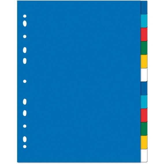 * Kolorowe przekładki w powiększonym formacie A4+, wykonane z wytrzymałego polipropylenu odpornego na zniszczenie - doskonałe do organizowania dokumentów w segregatorze. Komplet zawiera 12 przekładek z niezadrukowanymi indeksami. Na pierwszej karcie umieszczono specjalne miejsca do opisu zawartości.