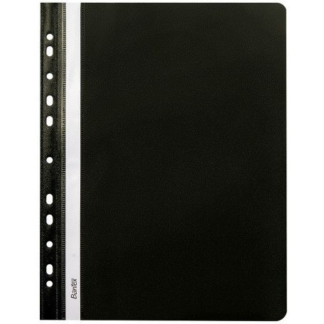 * Klasyczne skoroszyty w formacie A4, wykonane z polipropylenowej folii. Przednia okładka o grubości 120 mic. jest przezroczysta dla doskonałej widoczności dokumentów. Tylna okładka o grubości 170 mic. została wykonana z nieprzezroczystej, czarnej folii. Metalowe wąsy bezpiecznie mocują dokumenty w skoroszycie. Na grzbiecie znajduje się wymienny pasek do opisu zawartości. Uniwersalna perforacja umożliwia wpięcie skoroszytów do każdego segregatora.