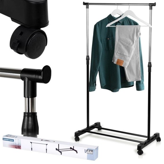 ⭐ Solidna konstrukcja - Wykonany z najwyższej jakości metalu w czarnym i srebrnym kolorze. Kółka oraz nogi wieszaka wykonane z tworzywa w kolorze czarnym. Odpowiedni materiał zapewnia mu stabilność.