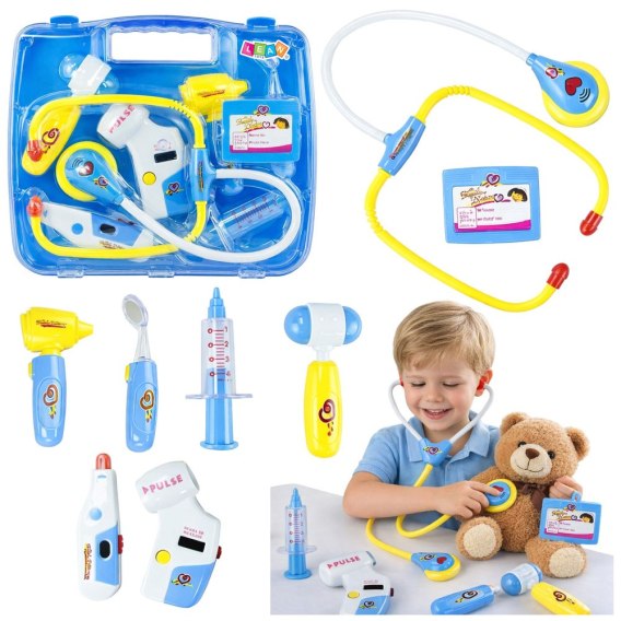 Ten wieloelementowy zestaw składa się z wszystkich narzędzi, które konieczne są w pracy lekarza. Zabawka utrzymana jest w neutralnej kolorystyce, składającej się z koloru niebieskiego, białego i żółtego, dzięki czemu będzie świetnym przedmiotem dla rodzeństwa — dziewczynki, jak i chłopca.